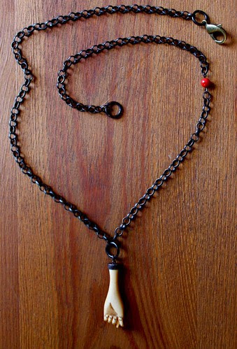 carved bone hand & coral on a blackened brass chain @ metal and thread, originally uploaded by denise carbonell.